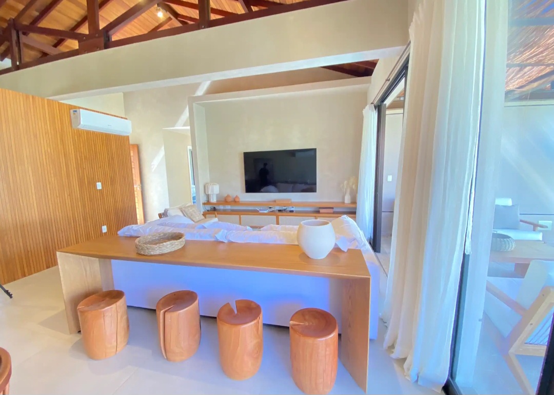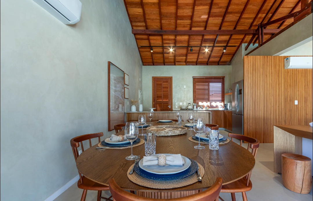 A casa possui sala de estar integrada à sala de jantar e TV, criando um ambiente moderno e acolhedor. A cozinha em conceito aberto é totalmente equipada e se conecta perfeitamente à área social, ideal para momentos de convivência entre os hóspedes.